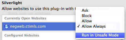In Safari 9 and earlier, click the button to the right of Navigator's web address and select "Run in Unsafe Mode" (i.e., unrestricted). Then, click Done, and when prompted, click the button to Trust the CTI Navigator website to run Silverlight in unsafe mode. Verify that the website setting button displays "Allow Always " with a warning symbol (a triangle around an exclamation mark). If only “Allow” or "Allow " are displayed, click the down arrow and select "Allow Always ".